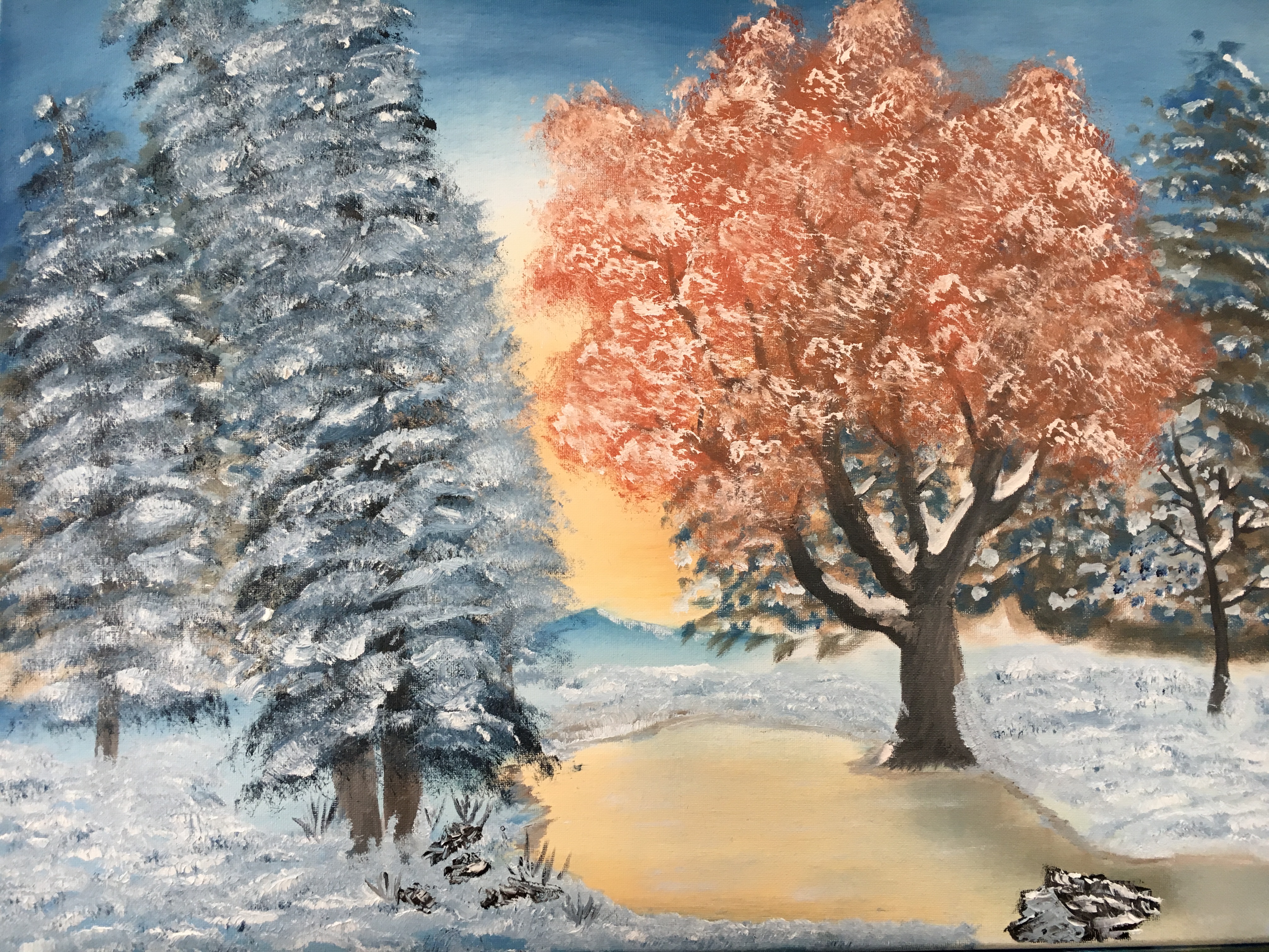 First Snowfall, completed January 8, 2017, using water-soluble oils. Unvarnished, 18×24 stretched canvas