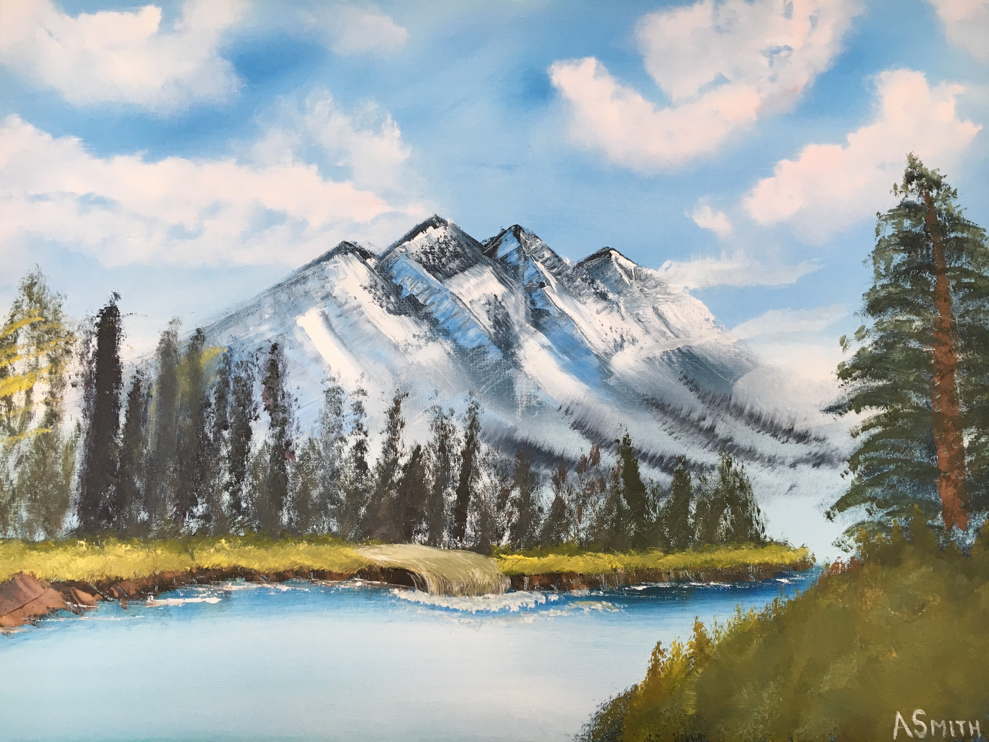 Another one of my earlier paintings and Bob Ross inspiration. Enjoyed painting this as even though it’s not my favorite, I painted this in conjunction with a family member who asked me to give her an art lesson. She painted the exact same painting and it’s now hanging in her home. 🙂